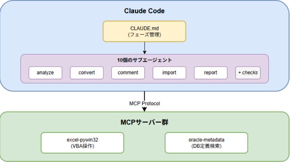 | エージェント定義ファイル(CLAUDE.md) | フェーズ管理、変換ルールの定義 |